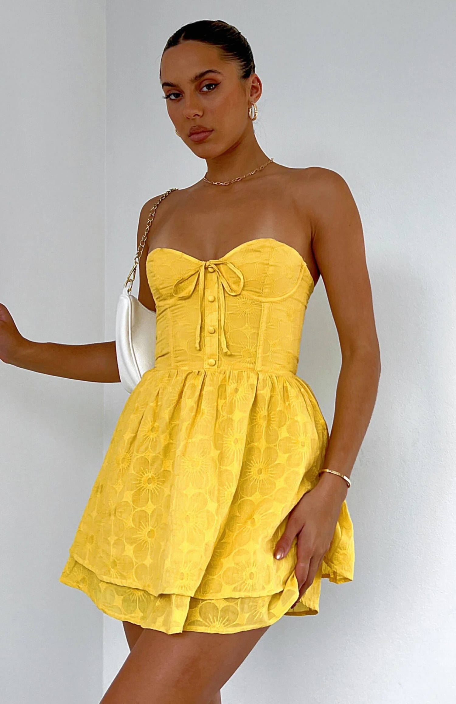 Dreaming of balmy summer holidays in the Flowers In The Rain Mini Dress in Buttercup. This strapless mini dress features bust underwire, tie and button front detail, boning in bodice, invisible zipper centre back and lined, broderie anglaise fabric. Pair with gold accessories and strappy heels for a look we love!