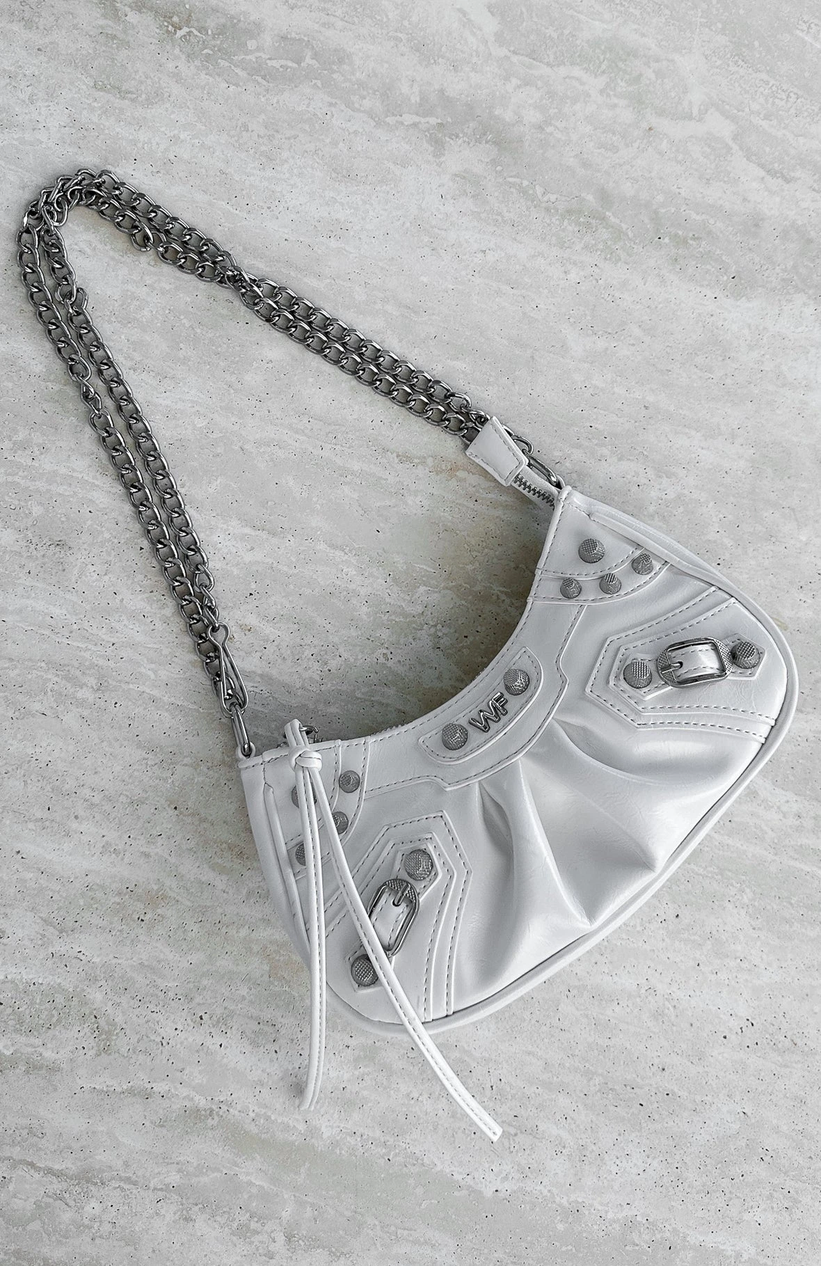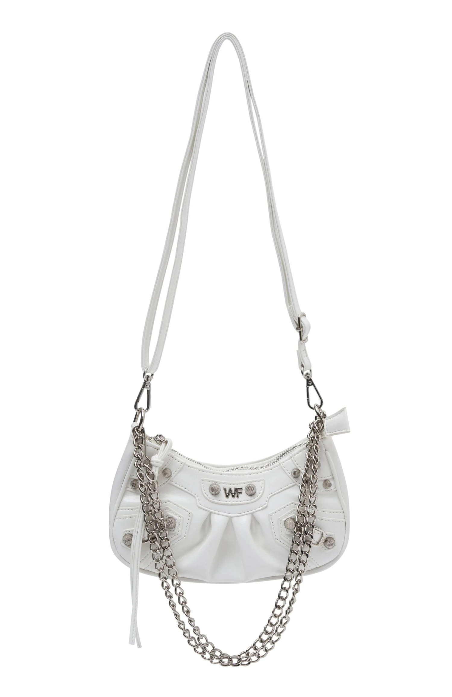 The Harlow Bag in White Pu will elevate any look! Featuring removable strap, double silver chain, WF plaque centre front and zip closure. We are obsessed!
