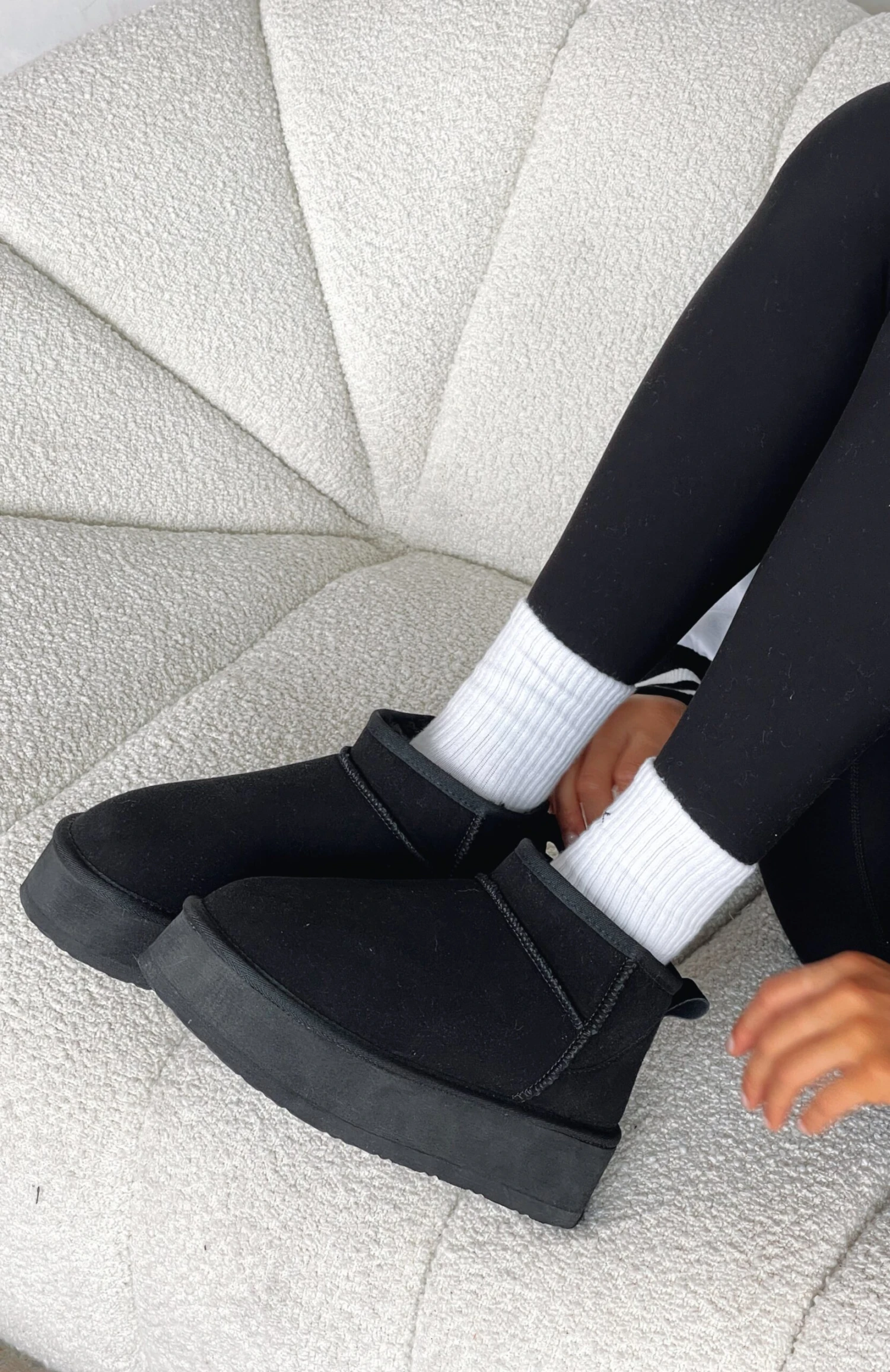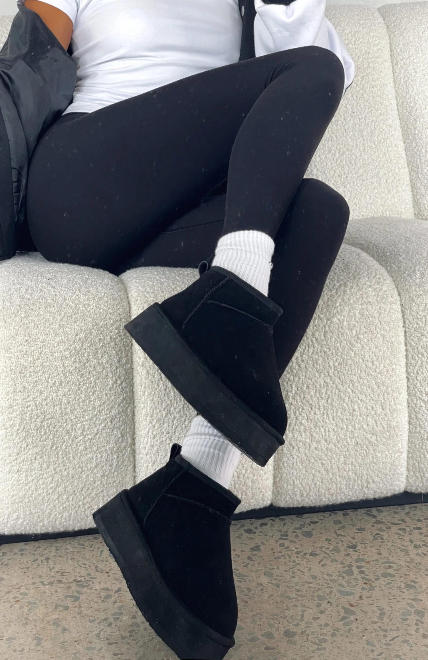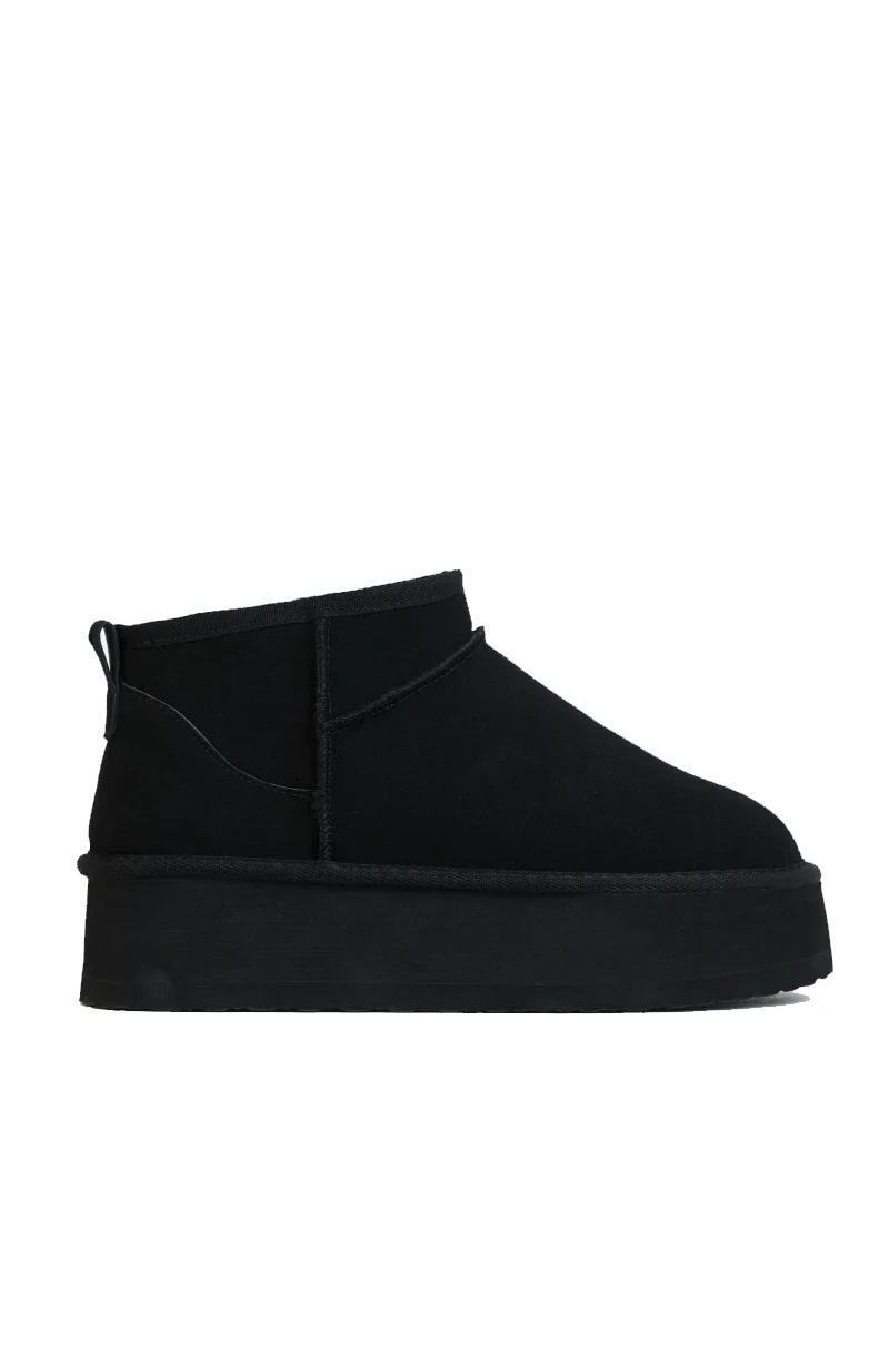 The Jet Setter Platform Snug Boots in Black are perfect for those cold weather days! Featuring slide on design, faux suede material with faux fur lining, platform sole and ultra mini length. You need these boots to complete your comfy and cosy look!