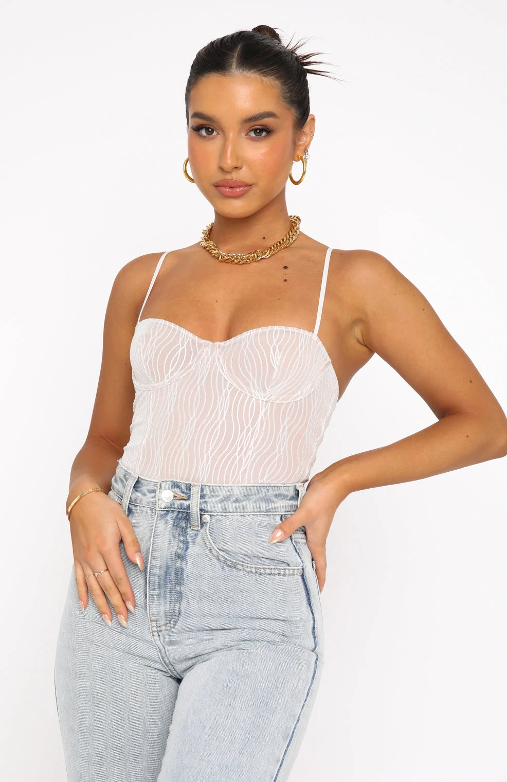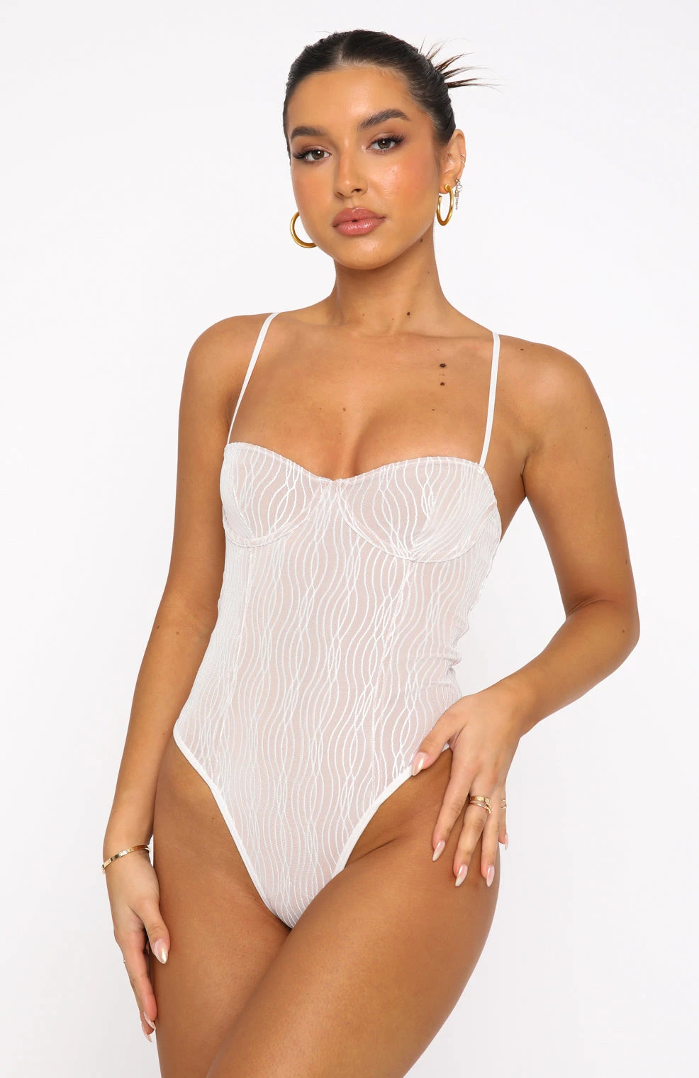 You’ll be looking dreamy in the Keep Wishing Mesh Bodysuit in White. Featuring thin, adjustable straps, bust underwire, flat hook and eye closure at bottom and lined to avoid sheerness. We love this paired with leather pants and heels for a chic look.Â