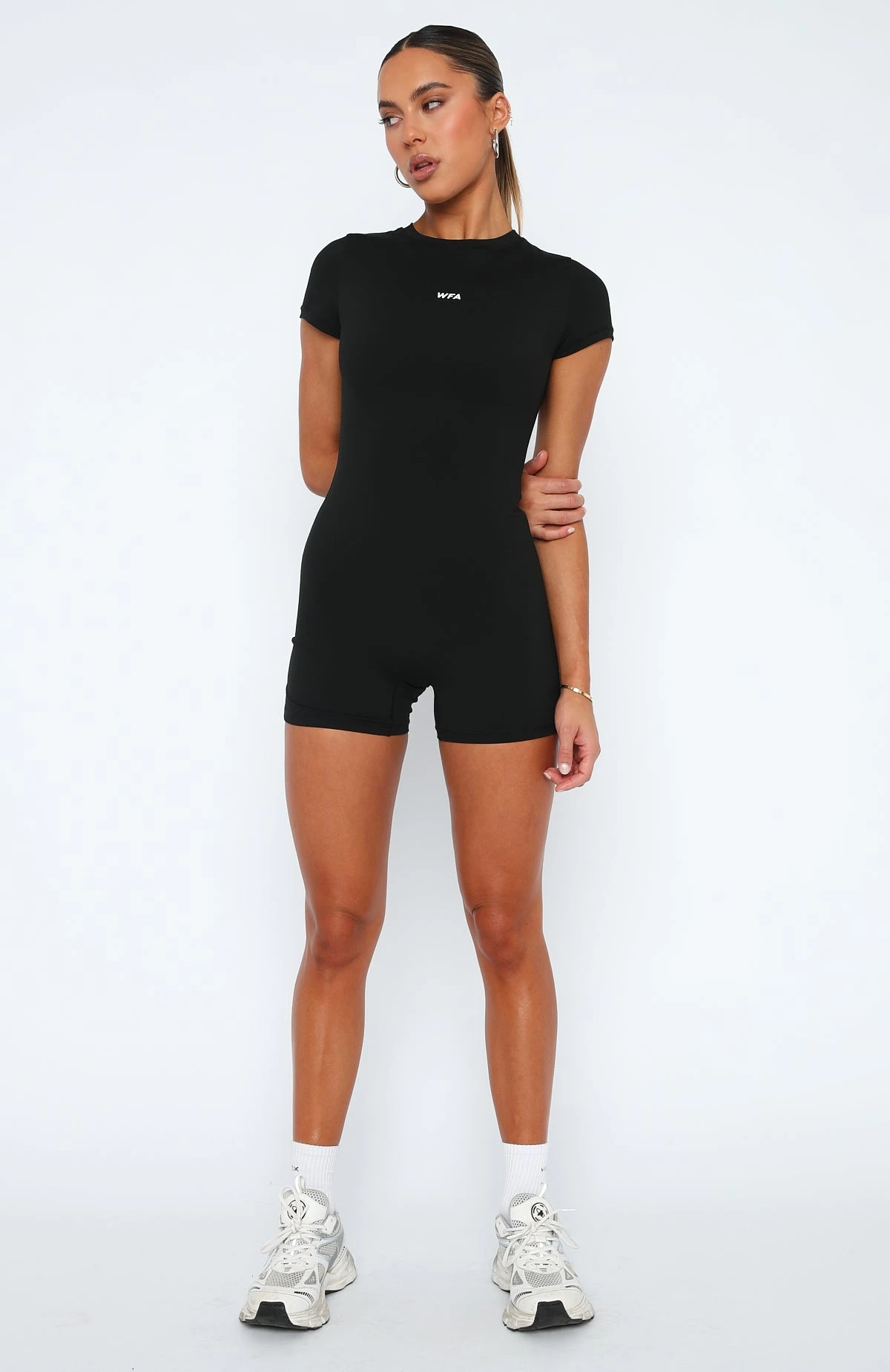 The Live For The Weekend Playsuit in Black will take you from pilates to coffee. Featuring short sleeves, invisible zipper centre back, mini short length and printed logo centre front. We love this paired with sneakers and your favourite gym workout!Â
