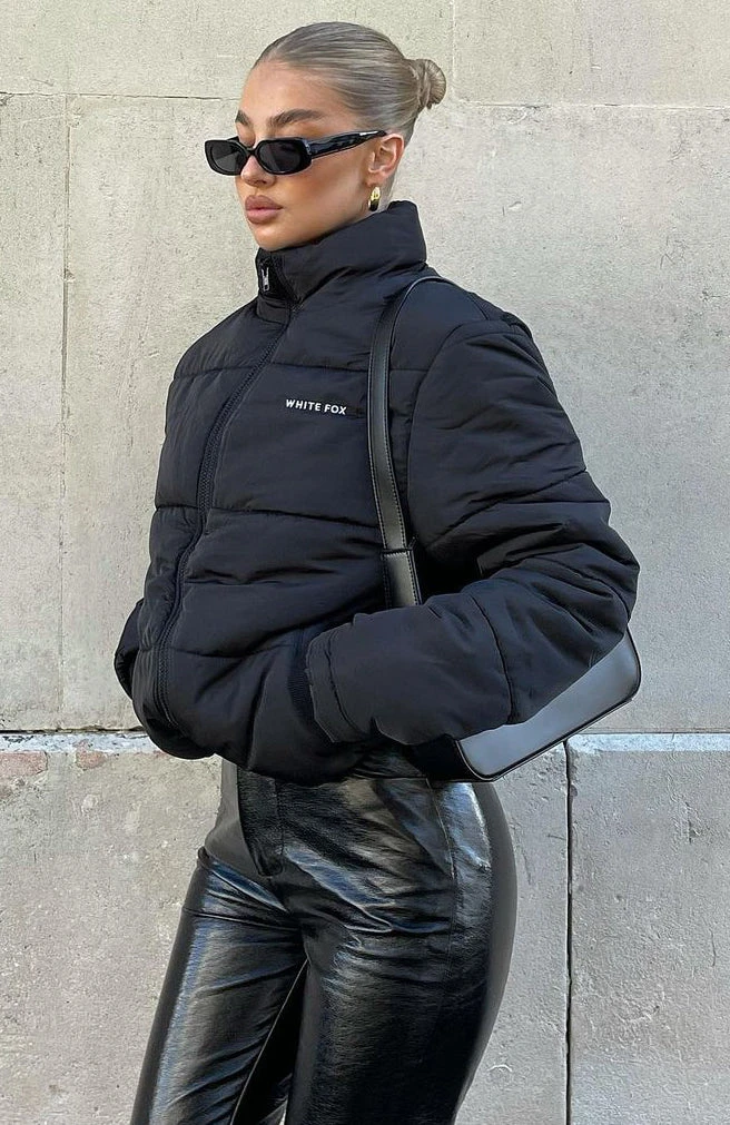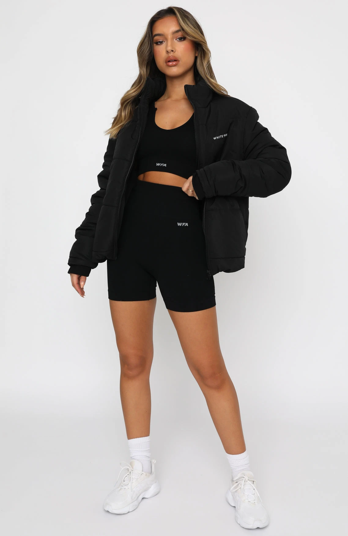 Keep warm look good in the Not Giving In Puffer Jacket in Black. Featuring functional zip closure, quilted sleeves and body, stand collar, front pockets and wf logo front side. This can be styled with any of your White Fox outfits for the added winter touch.