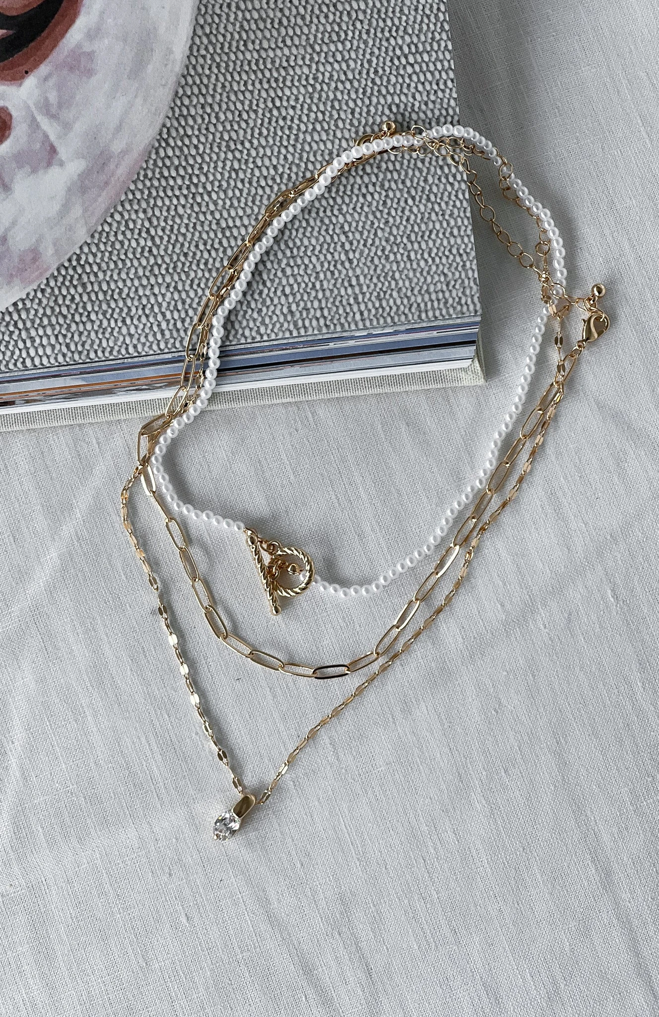 The Shae Necklace Set in Gold is our latest obsession! Featuring a set of three chains, two gold chains and faux pearl chain.